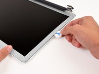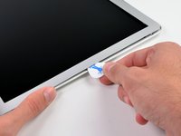 Work along the inner bottom left edge of the display assembly, carefully prying the adhesive up with the guitar pick.