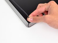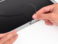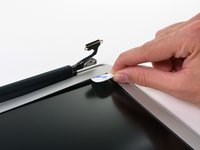 Work along the top left edge of the display assembly, carefully prying the adhesive up with the guitar pick. Stop when you get to the iSight camera.