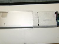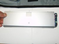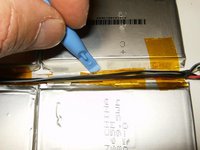 • Here is the battery removed from the aluminum case. The markings on the battery packs, showing through the thin paper, read " Made in China UPF497665M Sanyo B 9.5Wh 741-0005-A "