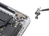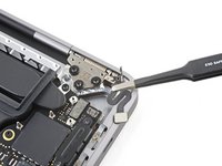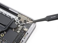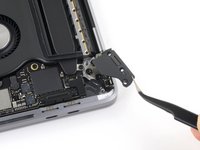 Using your tweezers, slide the bracket toward the side edge of the MacBook Pro until it clears the slotted retaining tab on the logic board.
