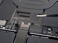 Pull the fan cable away from the logic board with tweezers to separate the adhesive.