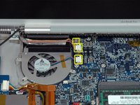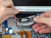 Remove the two silver T6 Torx screws securing the left fan to the lower case.
