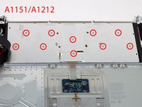 If you have a MacBook Pro 17" Model A1151 or A1212, refer to the first picture to remove the ten identical Phillips screws attaching the keyboard to the casing.