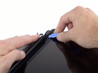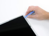 Insert a plastic opening tool underneath the black rubber gasket at the bottom left corner of the display assembly.