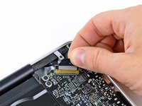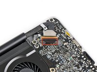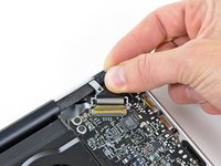 Lift the black plastic flap attached to the display data cable retainer and rotate it toward the DC-In side of the MacBook.