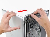 Grab the upper case with your right hand and rotate it slightly toward the top of the display so the upper display bracket clears the edge of the upper case.