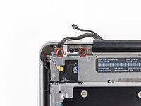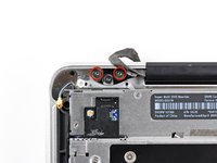 Remove the two 7.1 mm Phillips screws securing the camera cable retainer to the upper case.