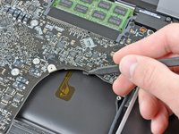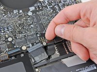 If present, grab the plastic tab attached to the battery connector and pull it toward the front edge of the device. For Late-2011 models the battery connector will not have a tab and is simply a plug that inserts straight down into the motherboard--to remove pry the plug straight up.
