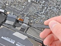 Lift the black plastic flap attached to the display data cable retainer and rotate it toward the DC-In side of the MacBook.