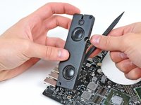 Slightly lift the left speaker assembly away from the logic board.