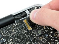 Carefully pull the camera cable connector toward the right side of the display and out of its socket on the AirPort card.
