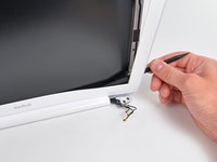 Continue prying until the front display bezel is free along the right side of the display and behind the right clutch hinge.