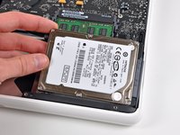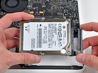 After removing two Phillips screws and the hard drive bracket, lift the drive out of the MacBook by its pull tab and disconnect the SATA connector.