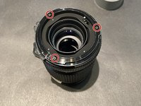 Flipping the lens around, remove the three marked screws to remove the lens bayonet mount.