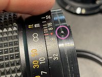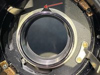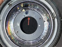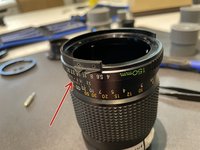 Now the aperture ring can be removed. The small, spring loaded ball detent is located near the center marking on the lens, show with a red arrow.