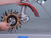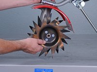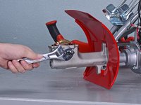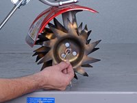 Use an adjustable wrench to turn the right half (in the orientation pictured) of the tine shaft clockwise, as shown.