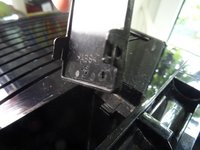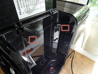 Die obere Abdeckung wird an der Seite mit der Brühgruppe mit drei Rasten festgehalten. Die Rasten können über einen Schlitz erreicht werden.
