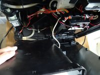 Am Seitenteil mit dem Wassertank ist der Zulaufschlauch vom Wassertank aufgesteckt und ein Kabel führt zum Wasserstandssensor. Löse beide ab.