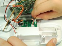 Use your hands to grip the plastic wire housing and detach the upper speaker wire connector from the speaker daughterboard.