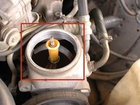 Inspect the thermostat housing, and the short hose below it, for leaks such as the one shown here.