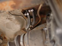 Look up at the end of the engine arms for a second look, from below, at the engine mounts. See that they are still holding the engine well up and away from the sub-frame and also that they do not look dry-rotted or otherwise deteriorated.