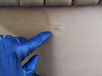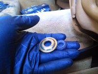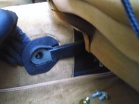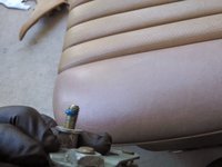 Behind the end of the seat rail you will find a large concave washer and a smaller rubber sealing washer (the hole that the bolt goes through is exposed to the outside). Make sure to note their orientation for replacement.