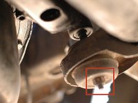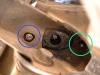 • Pictured are the bottoms of these two bolts. Inboard is shown highlighted in green, outboard in blue, to help show location from below the car.