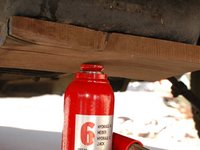 • Place your bottle jack under the oil pan and place a wide, thick piece of wood between the bottle jack and the oil pan to spread out the weight of the engine.