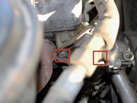 Next find the two long 13mm bolts that hold the A/C line bracket to the thermostat housing, and the housing to the cylinder head. One is hidden just behind the A/C line in this picture.