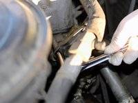 Use a Phillips head screw driver to loosen the hose clamp on the lower coolant hose where it attaches to the long lower neck of the thermostat housing.