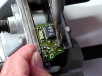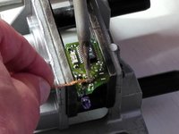 Once you've extracted the board, clamp it in the vice and identify the four solder joints that hold the button on the board.