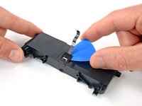 Slide the point of an opening pick underneath the battery flex cable to loosen the adhesive securing it from the headset.