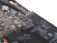 Use a spudger to disconnect the right interconnect cable from the motherboard by prying the connector straight up from its socket.