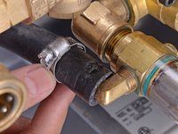 Wiggle the hose and pull it off of the brass nipple.