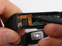 Using the spudger or the plastic opening tool, gently unhook the golden ribbon from the corner on the opposite side of the buttons. The part of the ribbon with the three boxes should then easily be detached from the band.