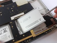 Use a plastic spudger to gently pry the battery. The battery runs underneath the motherboard. Pull free to the right.