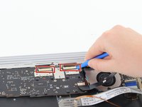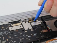 Use the plastic opening tool to slide ribbon cable toward the wall of the keyboard until the ribbon cables come loose.