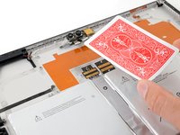 Slide the card side to side under the upper left battery cell to slice through the adhesive underneath.