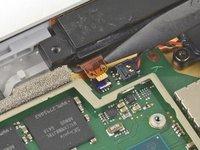 Lift the microSD card reader cable up and out of the way of the EMI shield covering the charging assembly.