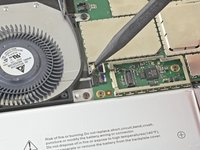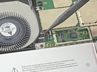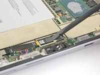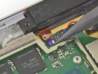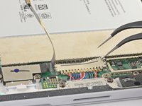 Insert one point of a pair of tweezers into a gap in the edge of the EMI shield covering the microSD card reader cable and connector.