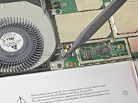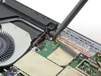 Insert the pointed end of a spudger into a screw hole in the fan shield and lift up to separate it from the fan.
