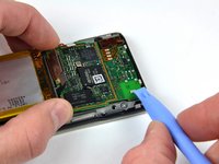 Use a Zune opening tool to push the small plastic clip securing the logic board near its lower left edge toward the headphone jack while gently lifting the upper edge of the logic board.
