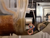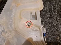 In this step, a hose must be removed, which can again result in dripping water. A little water may come out of the hose, and quite a bit out of the water bag. It is best to cover the machine underneath with a towel to avoid water getting on the electrics.