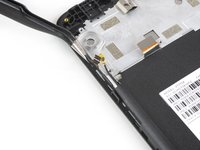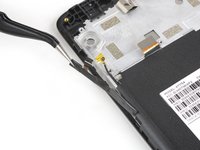 • Use the tip of an opening pick to pry up and open the black lever of the ZIF connector located at the top of the motherboard next to the rear camera.