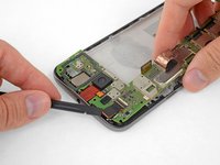Using your tweezers, grasp the headphone jack flex cable and carefully pull it out of its socket as you remove the motherboard.