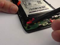 Using the tip of the spudger, lift the red silicone cover off the battery terminal screws.