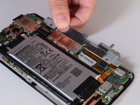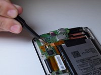 Gently lift up the motherboard and use the blunt tweezers to detach the black antenna cable connector near the top of the battery.
