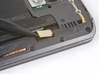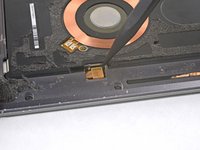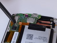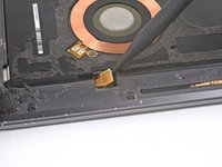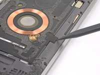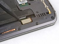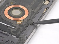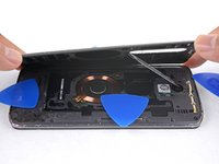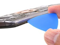 Using a plastic opening tool, unclip the small black ribbon near the upper right corner of the battery.