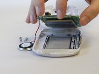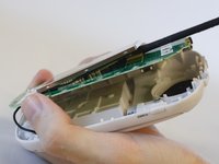 Lift the circuit board from the face of the shell, the back should still be connected by the antenna and the speaker.