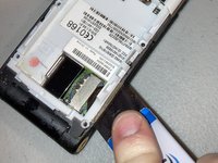 First, open the back of the phone by pushing up the battery door. Then, carefully remove the battery.